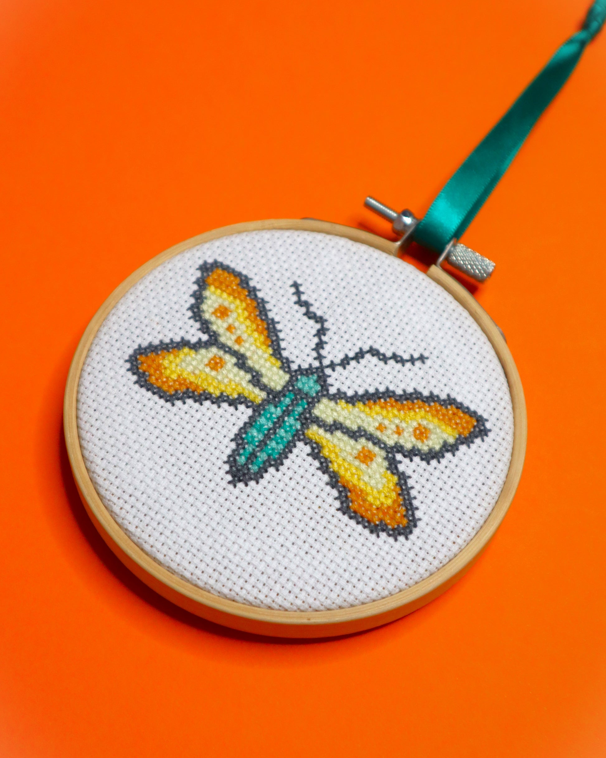 This pattern is designed to fit a 4” hoop when using 14 count aida.